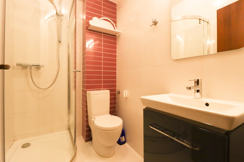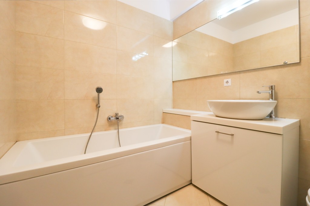 Grupul sanitar principal este dotat cu un lavoar și cadă, mașina de spălat își are locul aici și geamul este pentru o aerisire mult mai bună.