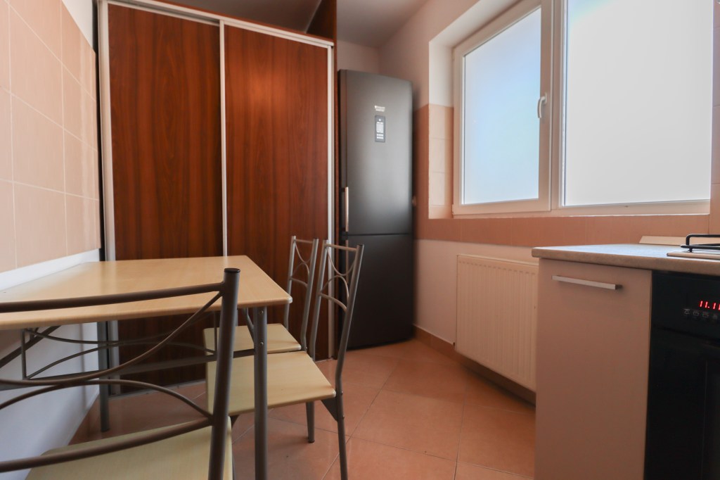 Spațioasă, 8 mp, mobilată și utilată complet vă așteaptă să o testați. Lângă frigider este o zonă de depozitare generoasă pentru a nu lăsa lucurile pe care nu vrei să le vezi la vedere iar la masă pot lua loc 4 persoane.