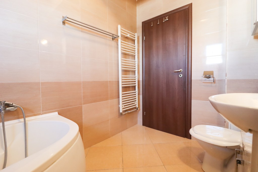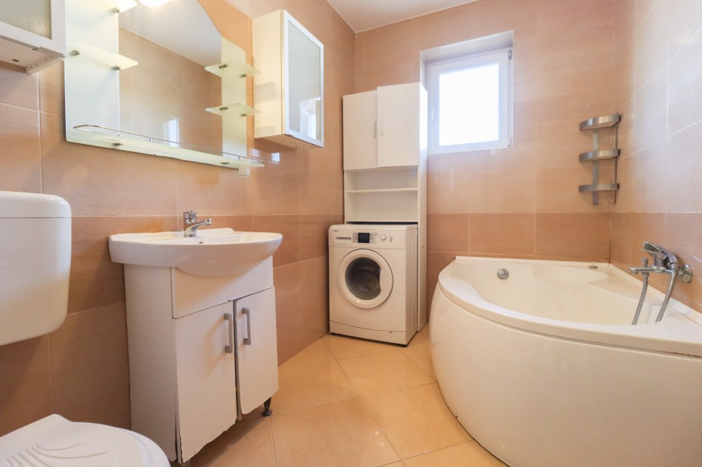 Simplu și elegant. Avem un lavoar, un wc și o cadă destul de mare. Mașina de spălat își are și ea locul aici iar geamul te va ajuta la o aerisire mai bună.