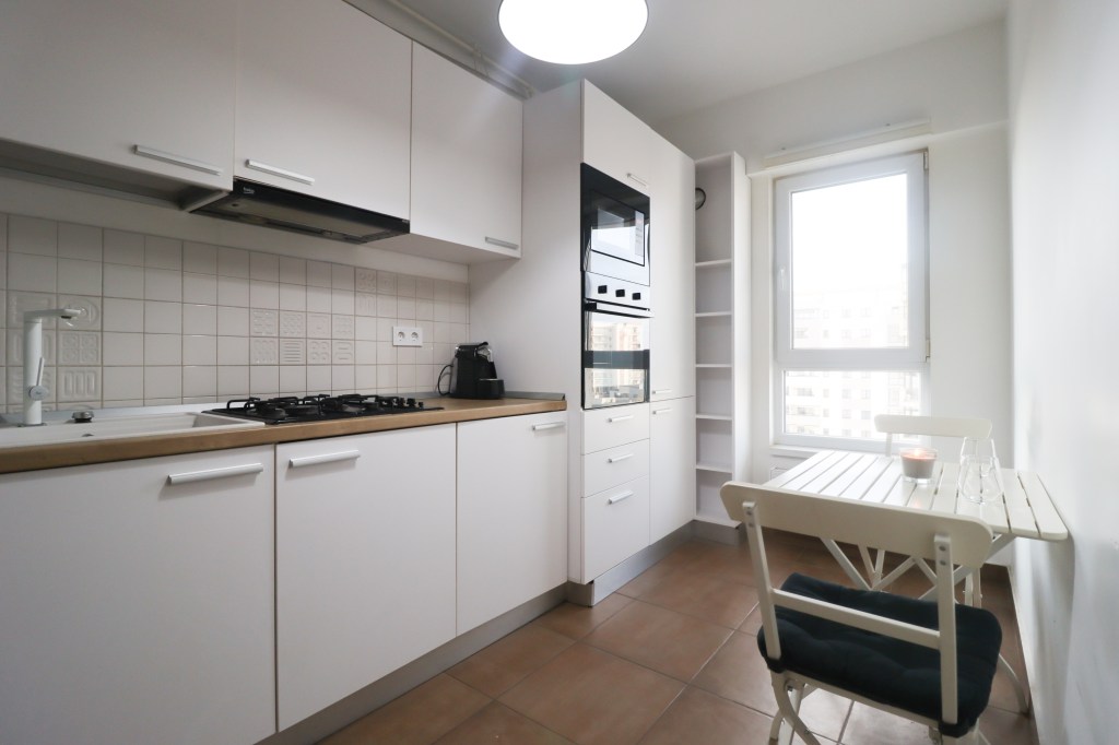 Bucătăria are 8 mp, este utilată complet, mașina de spalat rufe are și ea loc aici iar două persoane pot lua masa la locul special creeat.