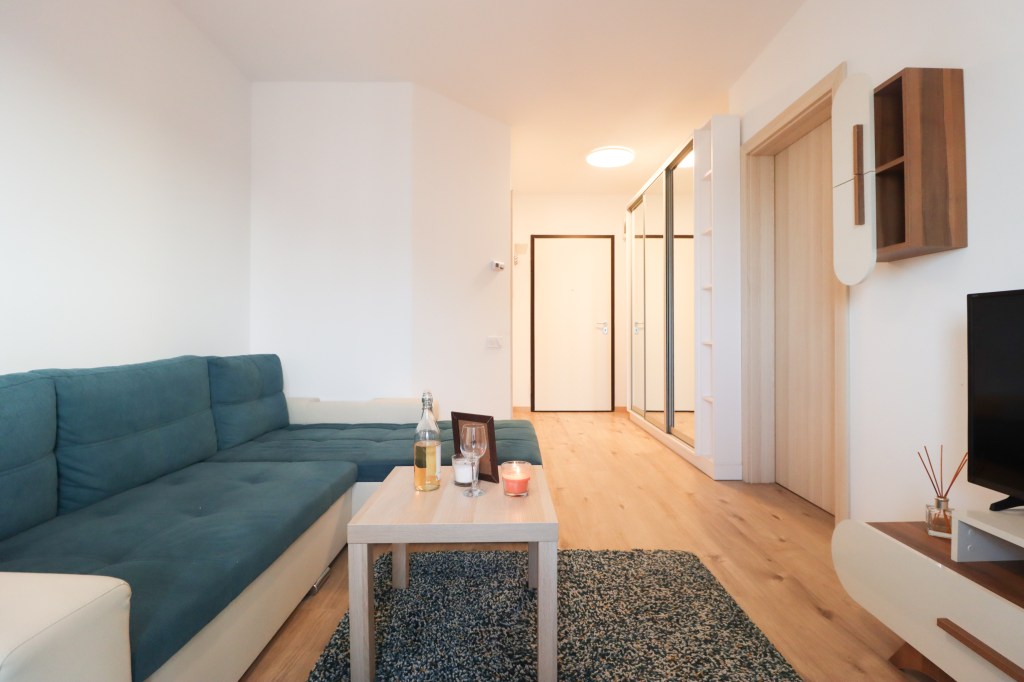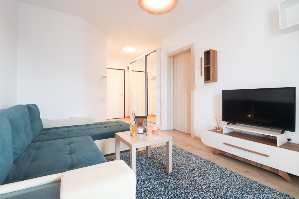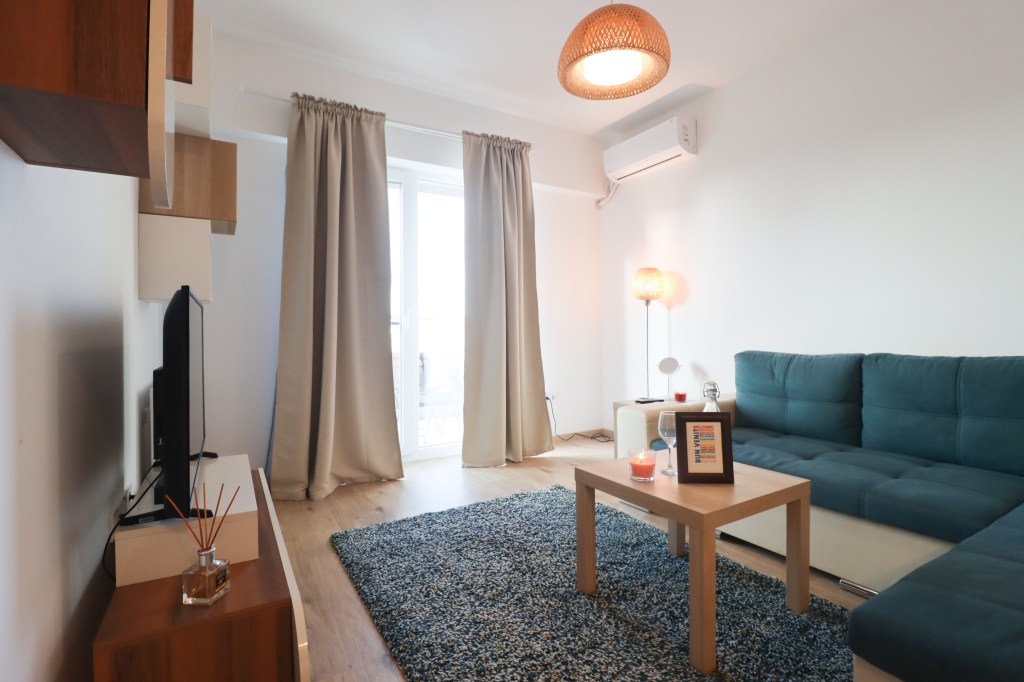 Practic este locul unde vei petrece cel mai mult timp și are 15 mp. Aici găsim o canapea extensibilă mare, o masuță de cafea, o comodă pe care avem amplasat televizorul și încă câteva corpuri de depozitare pe perete. De aici avem acces și către terasa de 5 mp ce are o panoramă asupra complexului.