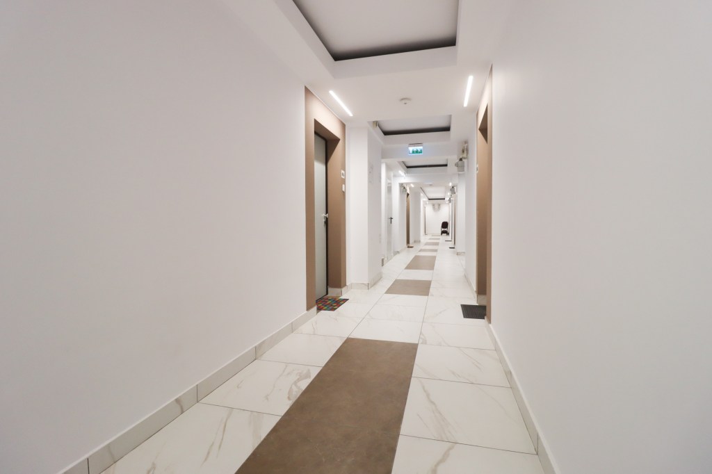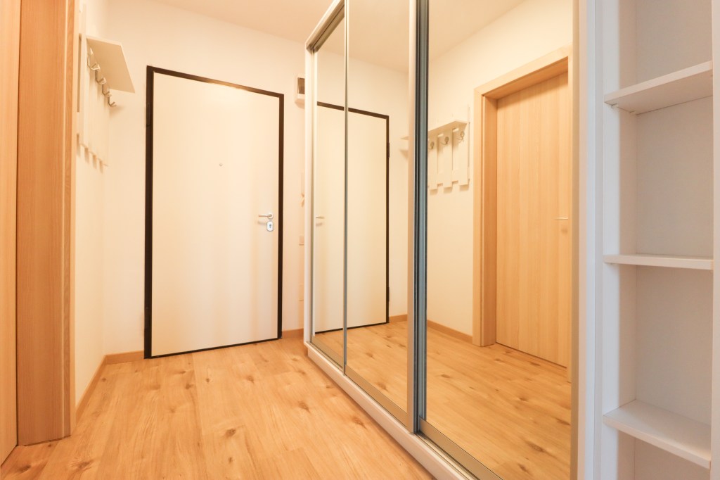 În momentul în care pășești înăuntru intri într-un hol, unde se găsește un cuier și un dressing foarte încăpător. De aici ai acces către grupul sanitar sau către cameră.