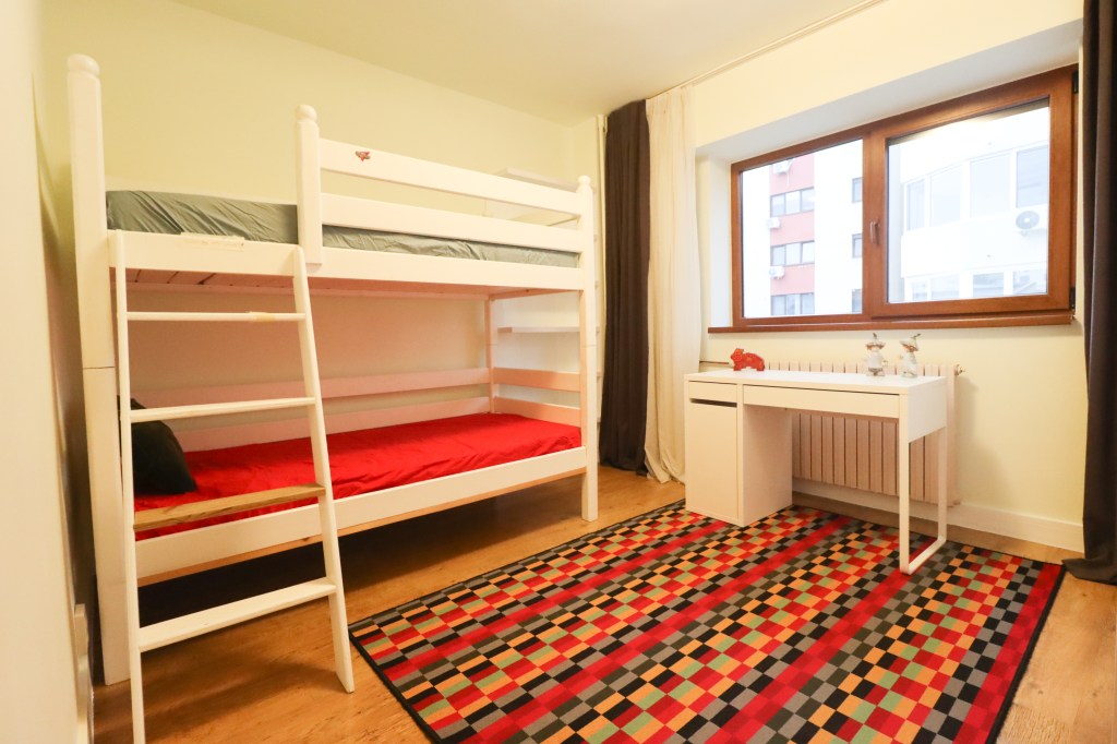 Are 11 mp și este potrivit pentru cei mici deoarece există un pat etajat. Pe lângă pat avem și un birou, un dressing și câteva spații pentru depozitare.