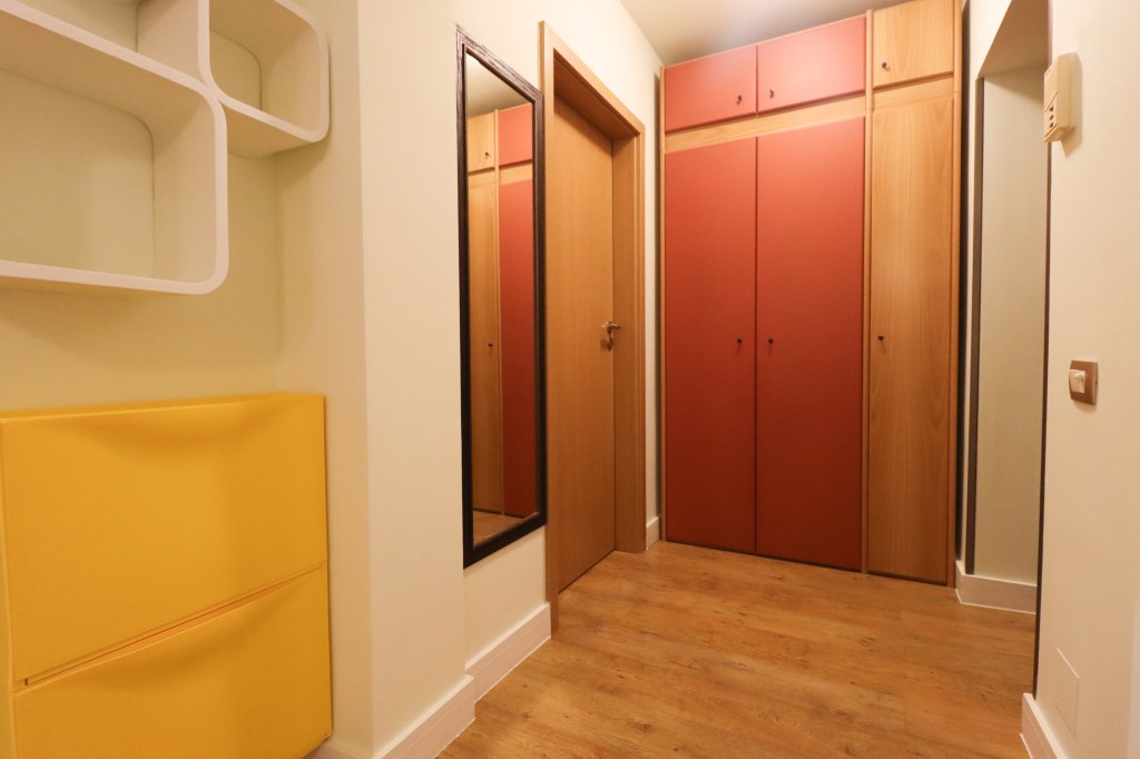 În momentul în care pășești înăuntru intri într-un hol unde avem un cuier, un pantofar și un mic dressing, pentru hainele groase de iarnă. De aici putem merge în dormitorul mare, sau în living-ul cu bucătărie deschisă.