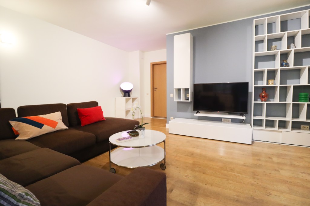 Însumate acestea au 37 mp (bucătăria 9 mp și living-ul 28 mp), o suprafață generoasă. În living avem o zonă de relaxare, cu o canapea mare unde putem să ne uităm împreună cu familia la un film și o zonă de lucru, unde avem un birou. Bucătăria este complet mobilată și utilată și în zona de dining pot lua masa 4 persoane. Să nu uităm că mașina de spălat rufe are locul aici. Din living putem merge pe cel de-al doilea balcon sau în dormitorul mic sau grupul sanitar principal.