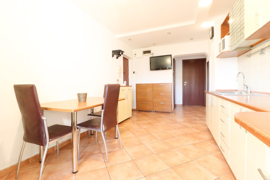 Aceasta este generoasă, avem zona de gătit pe partea stângă, unde găsim un blat generos încăt să poți găti liniștit iar pe partea dreaptă avem un loc de luat masa pentru 3 persoane.