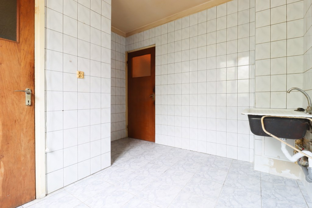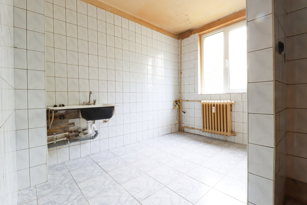 Este încăpătoare, are 8 mp. Ce poți face într-o bucătărie de 8 mp? Destule. Blatul de lucru pe partea stângă iar un loc de luat masa pe partea dreaptă, după ce o mărești la prin demolarea debaralei.