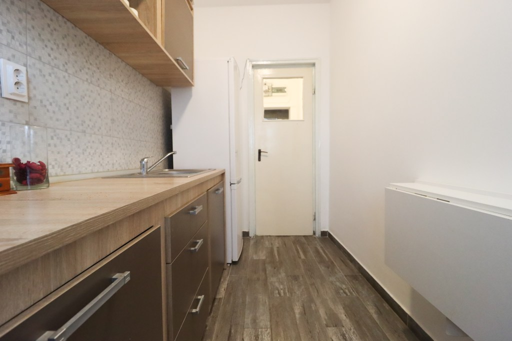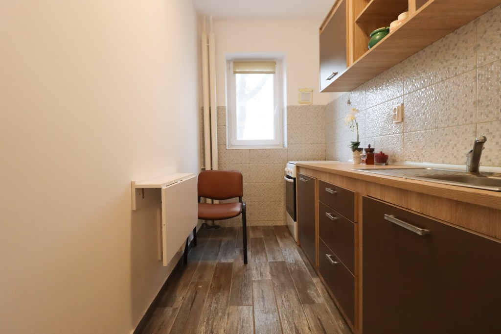 Nu este mică, are 6 mp. Avem pe partea dreaptă zona de preparare (aragazul se schimbă) iar pe partea stângă o zonă de luat masa pentru două persoane.