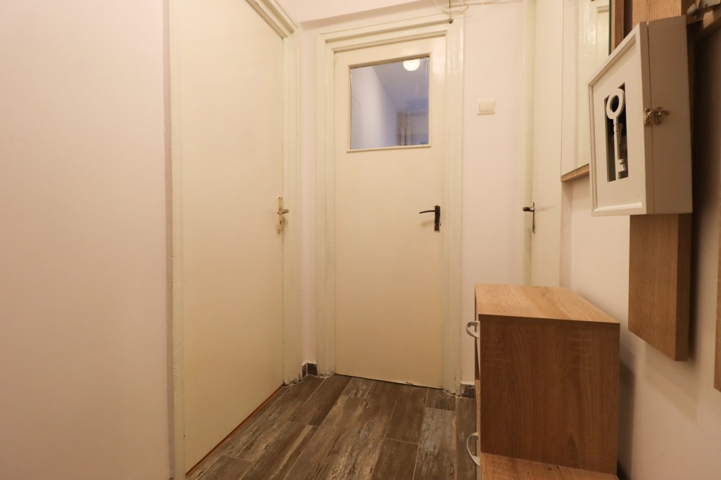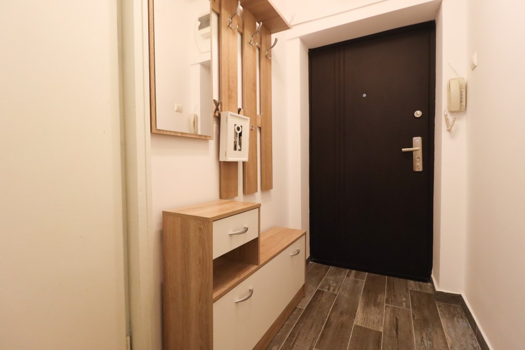 În momentul în care pășești înăuntru intri într-un hol unde se găsește un cuier cu pantofar și o debara în care se pot depozita lucururi. Înainte avem bucătăria iar în partea stângă living-ul.