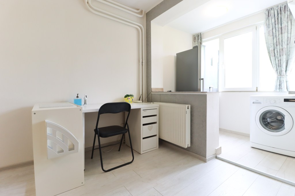 Practic este locul unde vei petrece cel mai mult timp și are 18 mp. Aici găsim o un pat, o masuță de cafea, o comodă pe care avem amplasat televizorul, încă un dressing și biroul. Balconul, care a fost deschis cu camera, are 3 mp și este locul frigiderului și a mașinii de spălat rufe. De aici avem acces și în bucătărie.