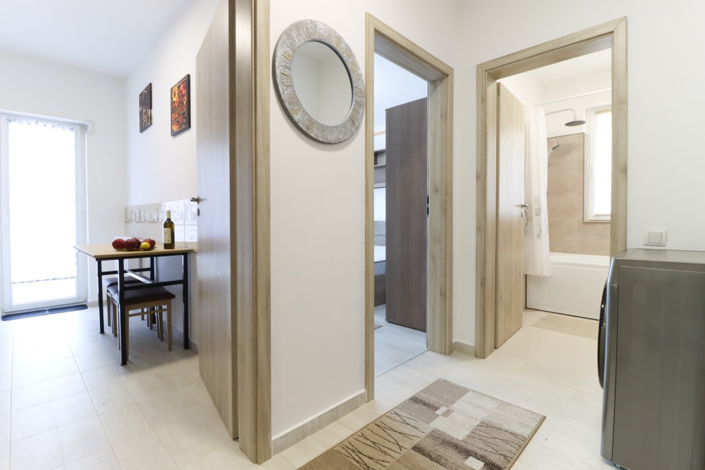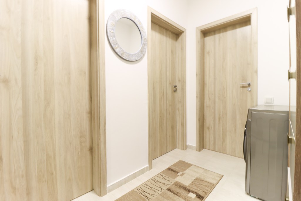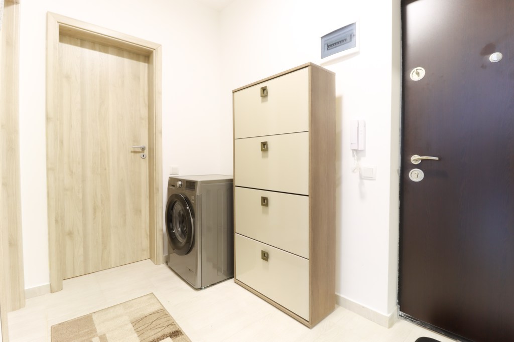 În momentul în care pășești înăuntru intri într-un hol generos, așa cum vă place, 5 mp, în care avem un pantofar, un dressing și lângă grupul sanitar este mașina de spălat rufe. De aici înainte avem bucătăria iar în partea dreaptă camera și grupul sanitar.