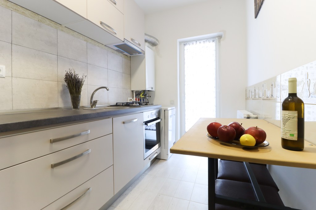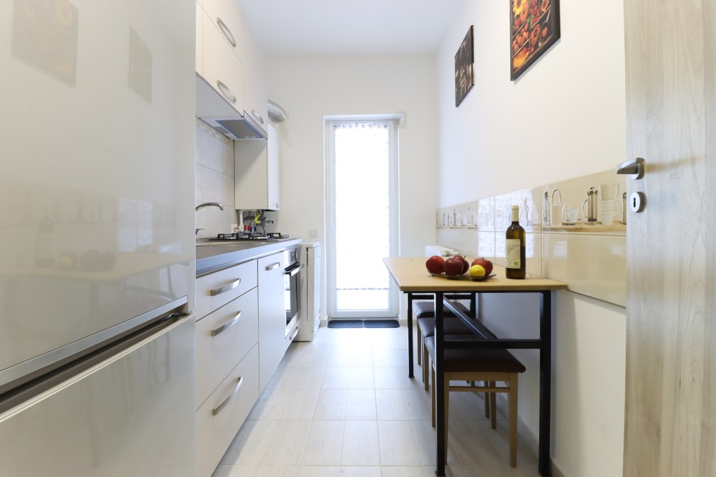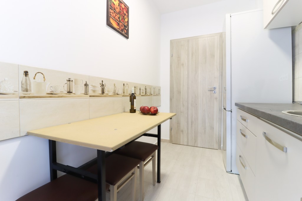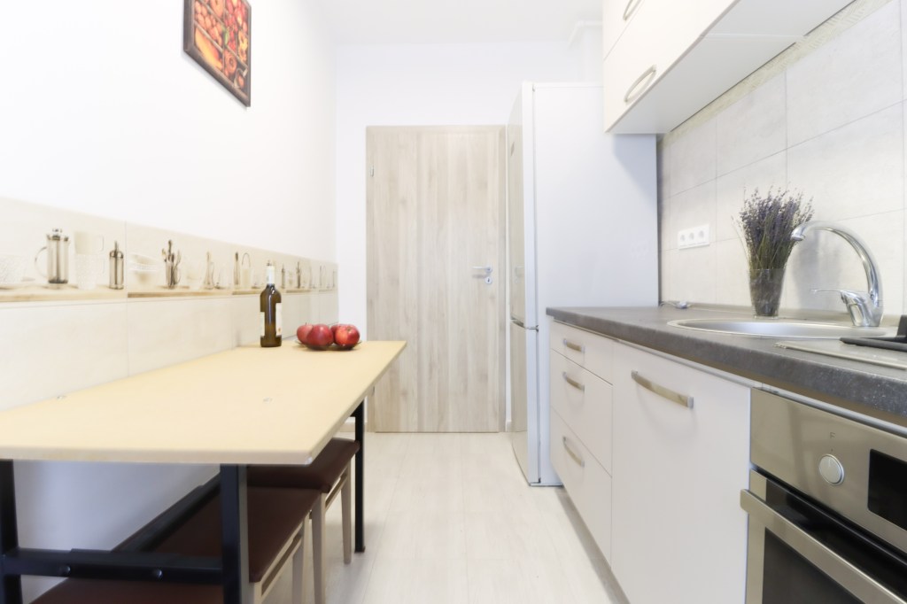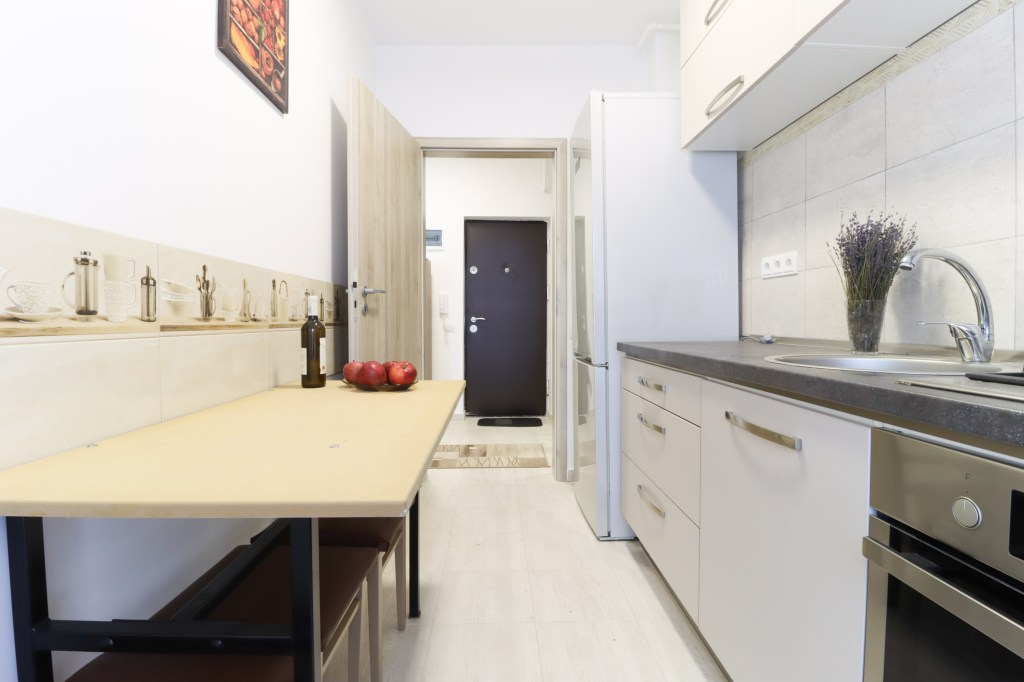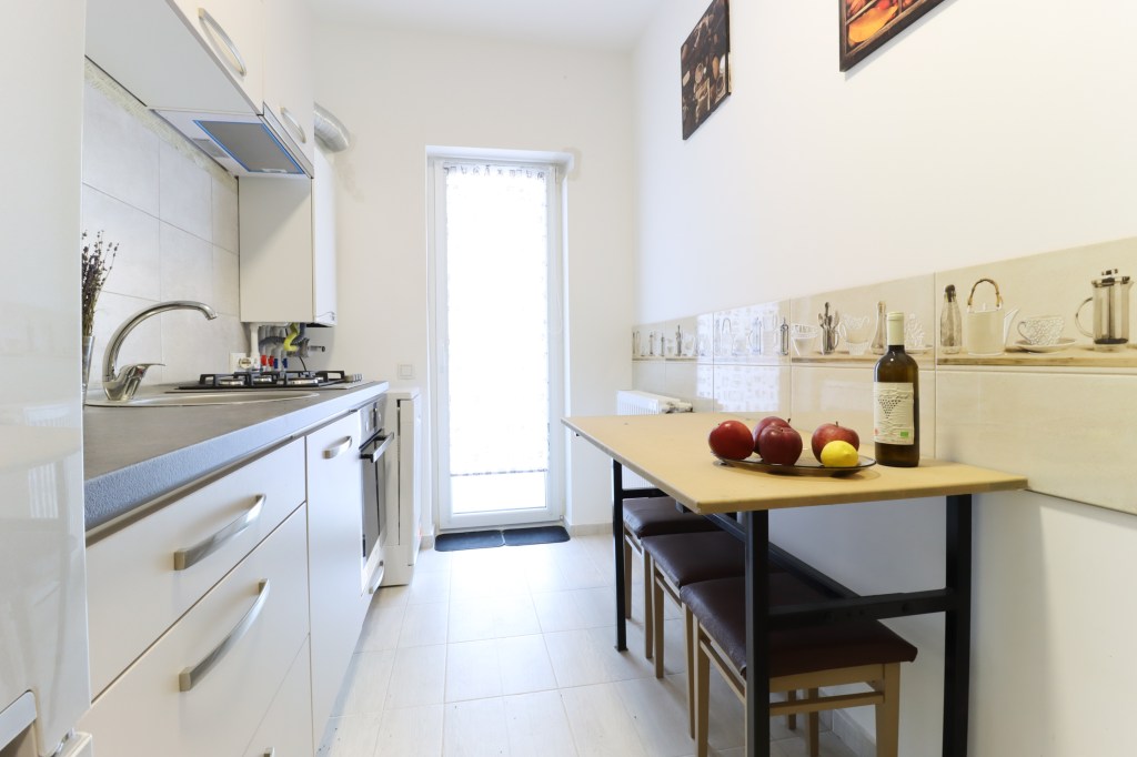Bucătăria are 6 mp, este utilată complet, avem mașină de spălat vase și este ideală pentru o persoană care mai gătește. Pe partea drepată avem zona de luat masa pentru 3 persoane iar pe partea stângă zona de gătit.