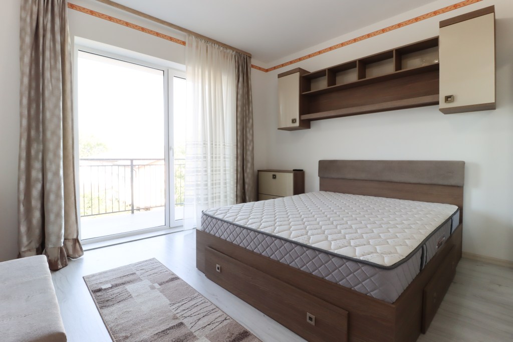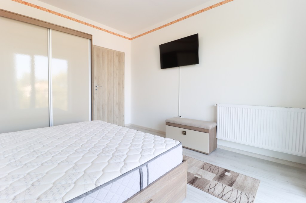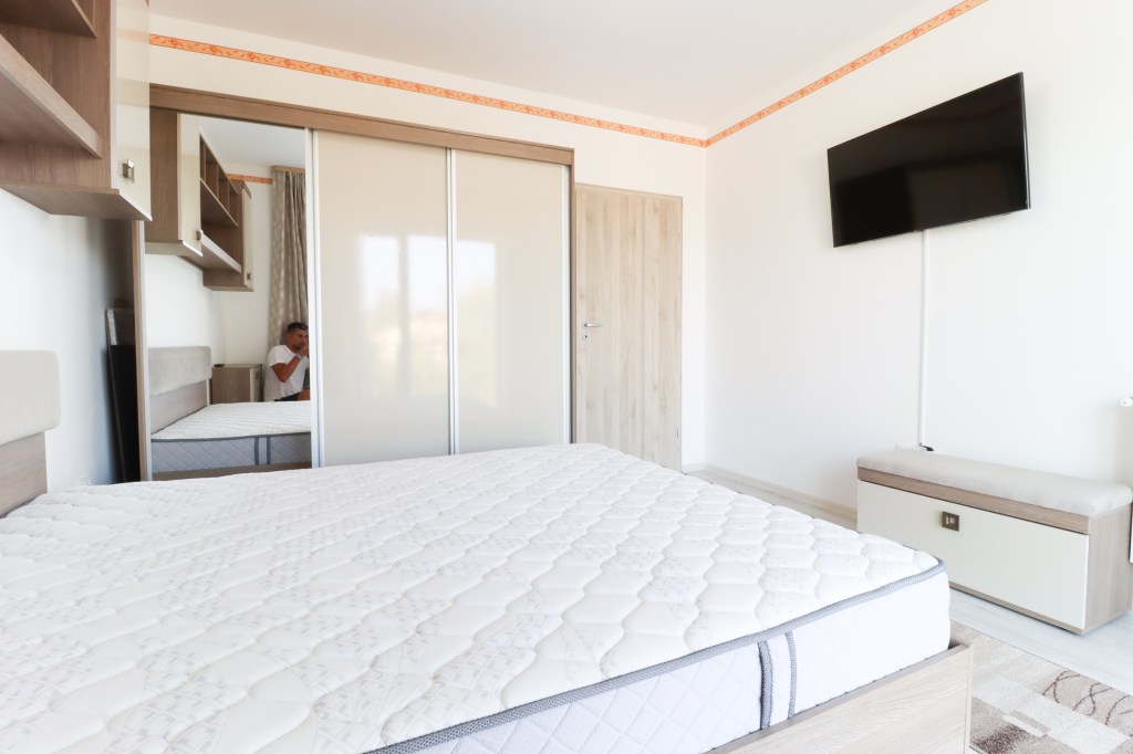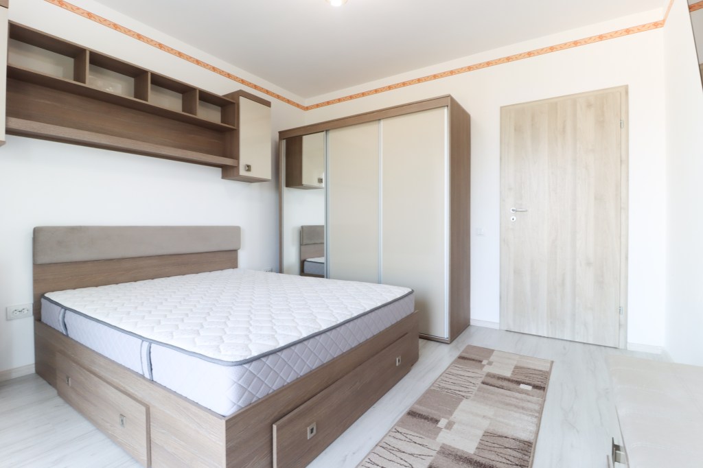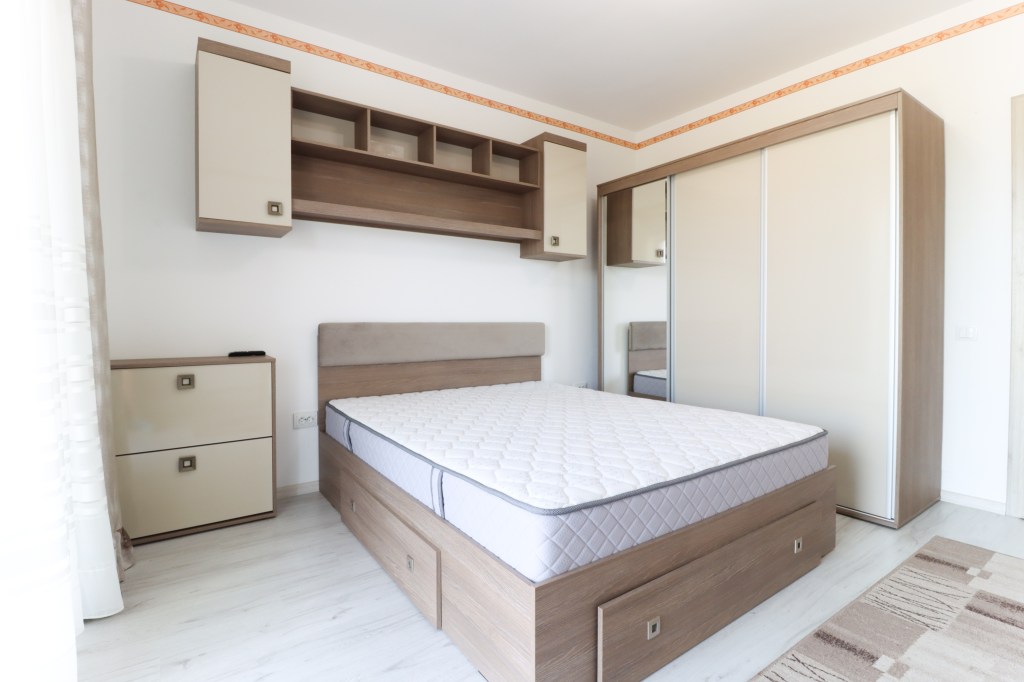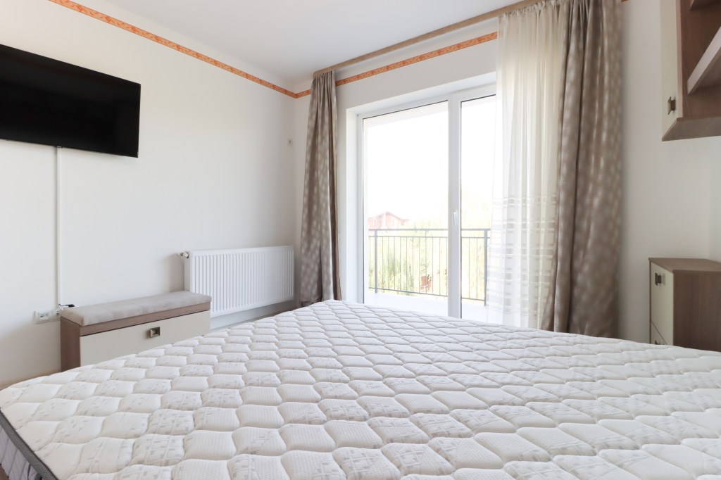 Practic este locul unde vei petrece cel mai mult timp și are 14 mp. Aici găsim un pat pentru două persoane, un dressing încăpător, mai multe corpuri pentru depozitare și televizorul. Avem acces și către balconul de 15 mp deschis ce poate sa fie o zonă de relaxare și de depozitare (accesul se poate face și prin bucătărie).