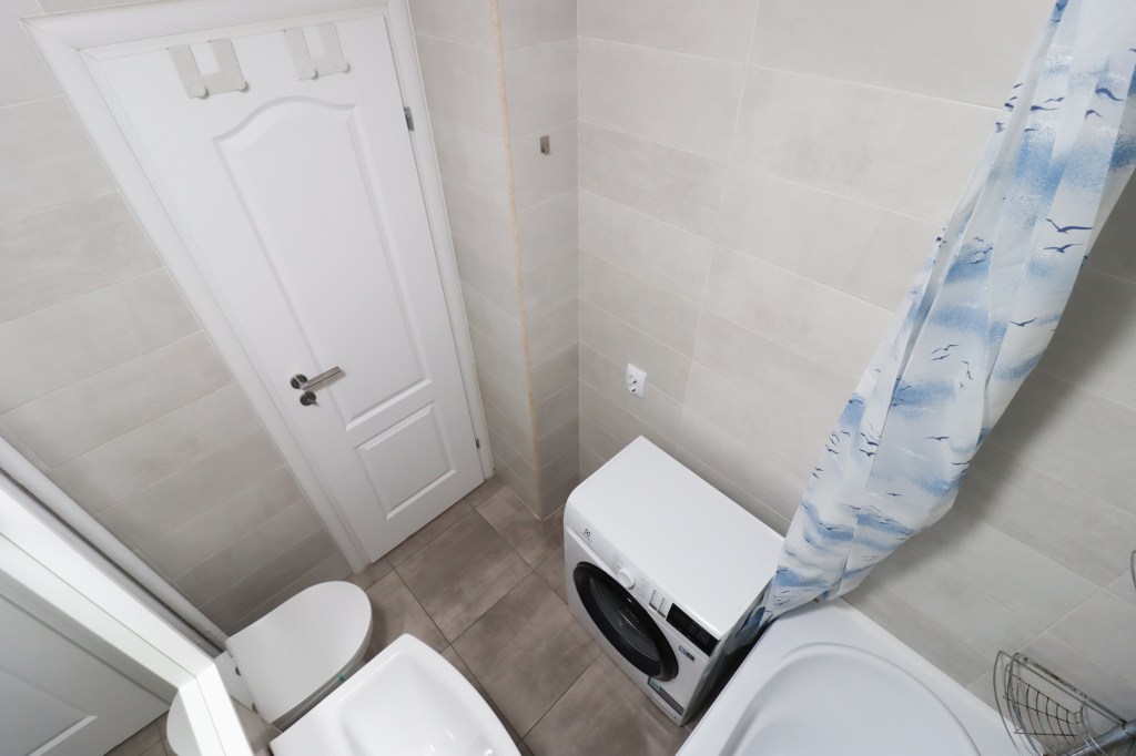 Grupul sanitar este dotat cu cadă și lavoar iar pentru o aerisire mai bună există un ventilator ce își face treaba iar mașina de spălat rufe își are și ea locul aici.