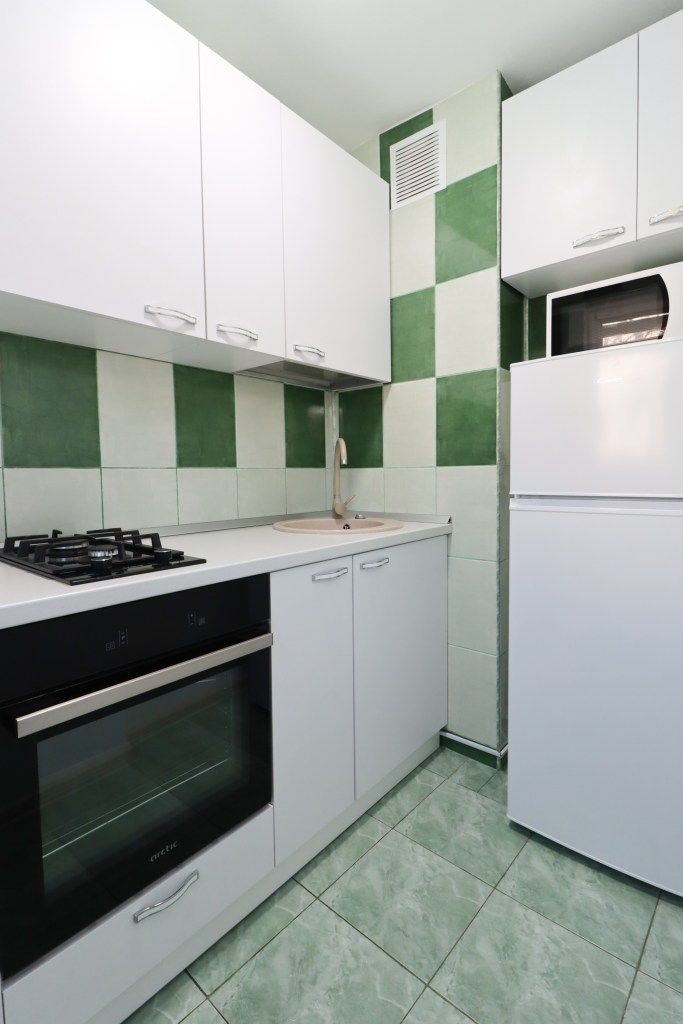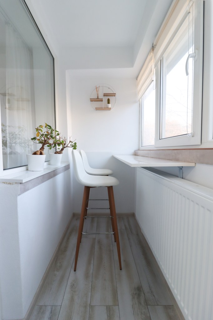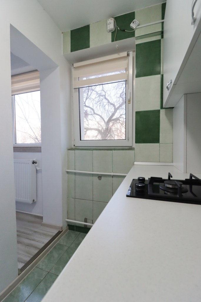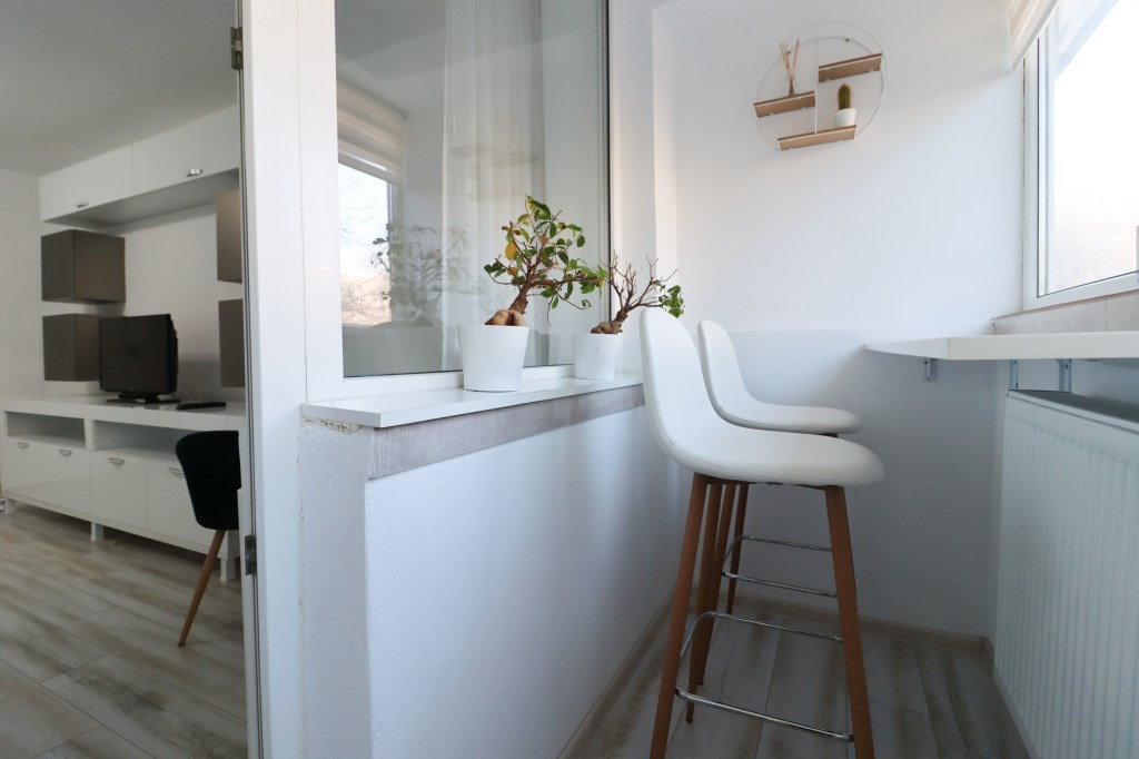 Bucătăria are 3 mp, este mobilată complet și utilată iar pentru a creea mai mult spațiu zona de luat masa este în balconul de 2 mp unde avem un blat pe perete și două scaune tip bar.