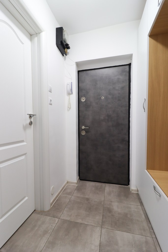 În momentul în care pășești înăuntru intri într-un hol, unde se găsește un dressing încăpător, ce are și cuier și pantofar. De aici ai acces către grupul sanitar în partea dreaptă sau către cameră înainte.