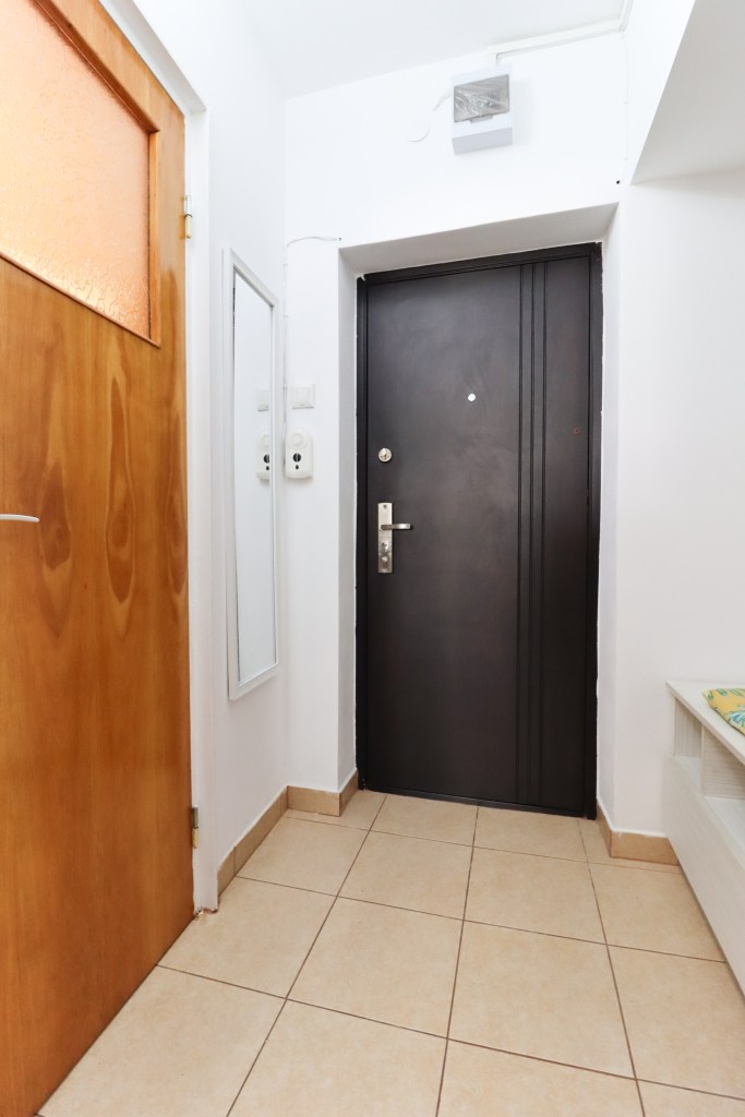 În momentul în care pășești înăuntru intri într-un hol, unde se găsește un dressing ce are și cuier și pantofar. De aici ai acces către grupul sanitar în partea dreaptă sau către cameră înainte.