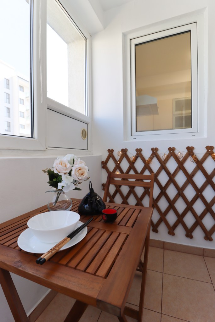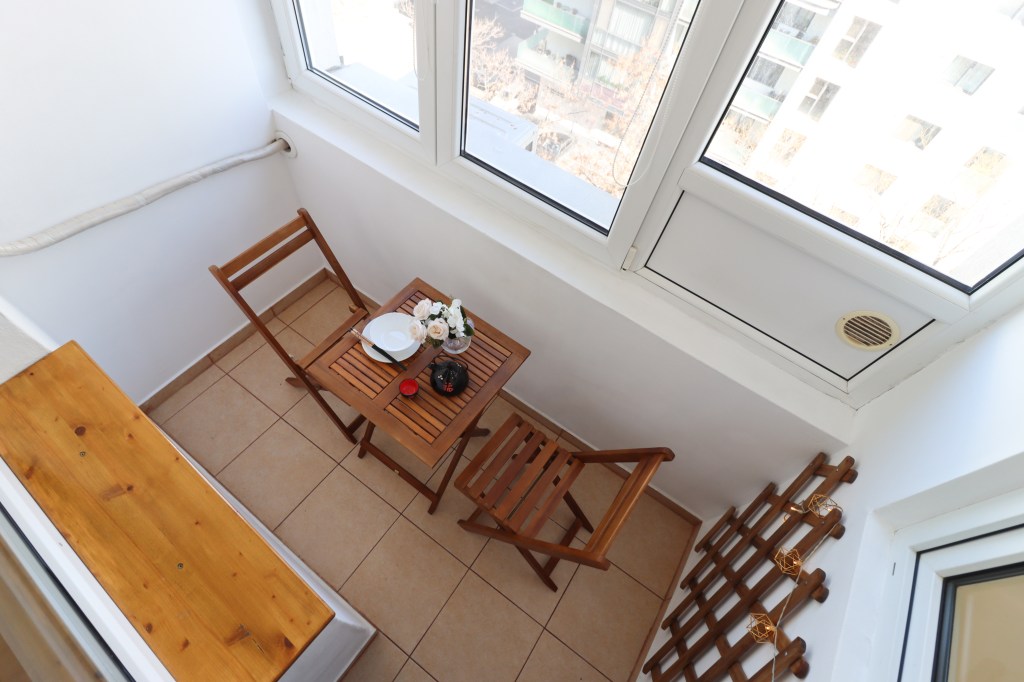 Bucătăria are 3 mp, este mobilată complet și utilată, blatul de lucru este generos iar ca zonă de luat masa poți folosi balconul de 2 mp unde există o masă cu două scaune.