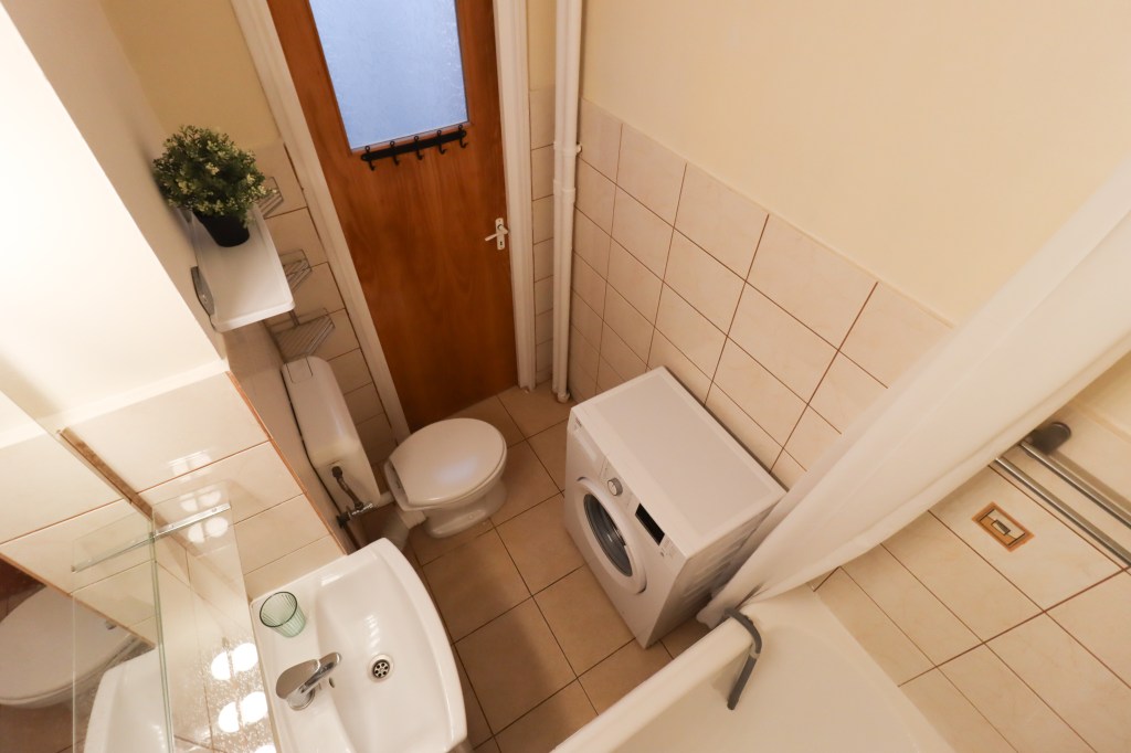 Grupul sanitar este dotat cu cadă și lavoar iar mașina de spălat rufe își are și ea locul aici.
