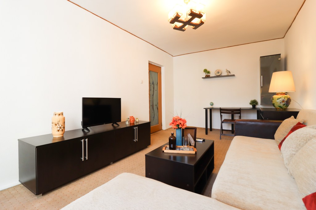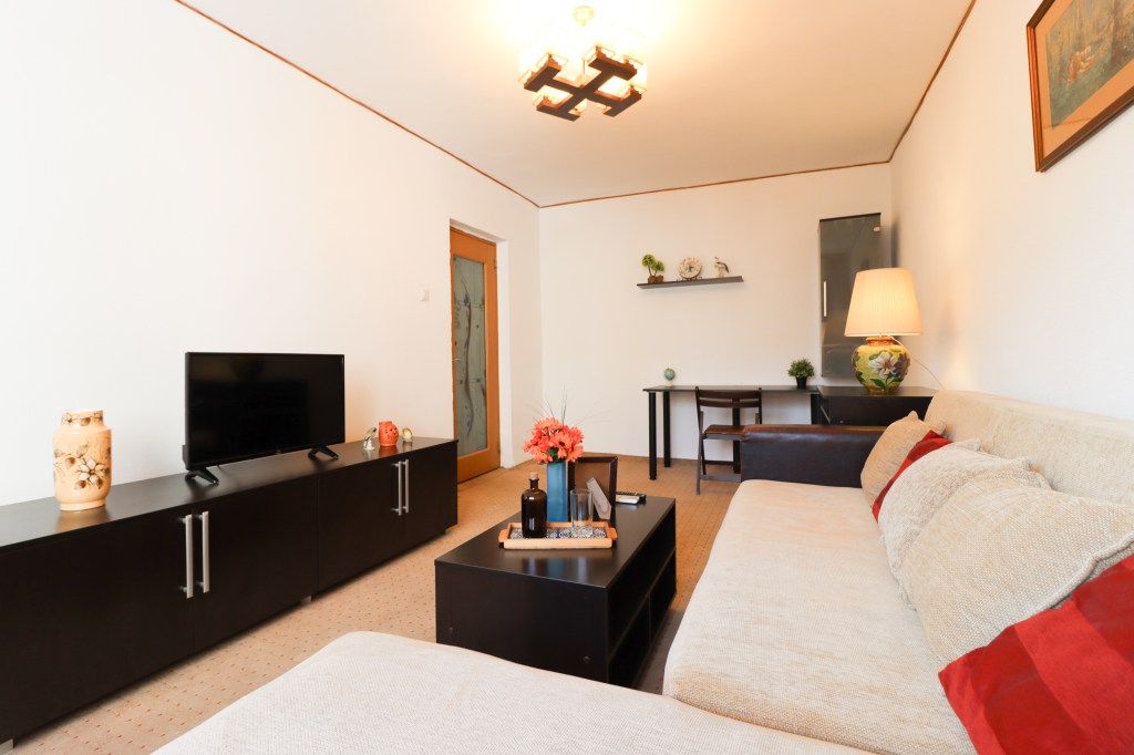 Livingul are o suprafață generoasă (17 mp) în care ai loc să te desfășori. Aici găsim o canapea extensibilă cu o măsuță de cafea, o comodă pe care stă televizorul, o bibliotecă mică și un birou unde poți lucra de acasă cu câteva spații pentru depozitare . De aici avem acces și către balconul de 4 mp ce poate servi ca loc de relaxare sau depozitare.