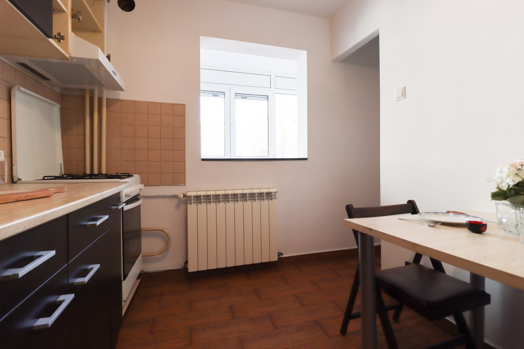 Este încăpătoare 7 mp și utilată complet. Avem un blat generos pentru cei care gătesc, multe spații de depozitare, o masă la care pot lua loc trei persoane și la cămară a fost scoasă ușa și este poziționat frigiderul acolo (ușile de la mobila deasupra hotei urează să se monteze iar tubulatura de la hotă la fel).