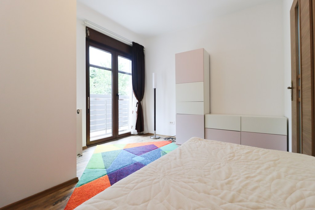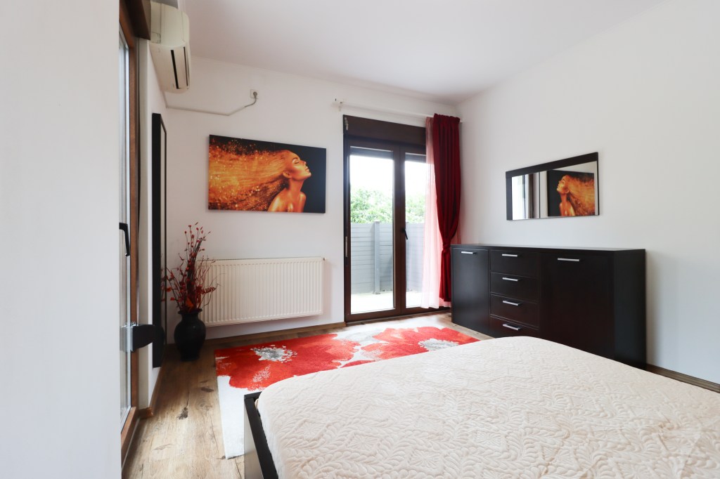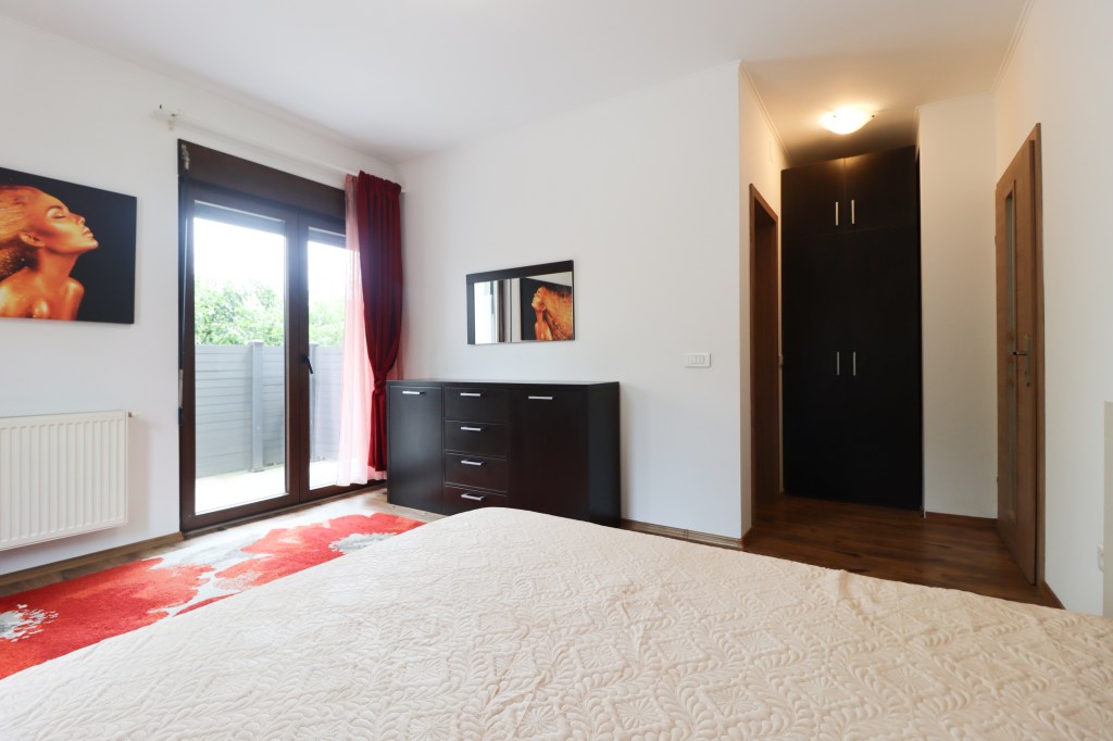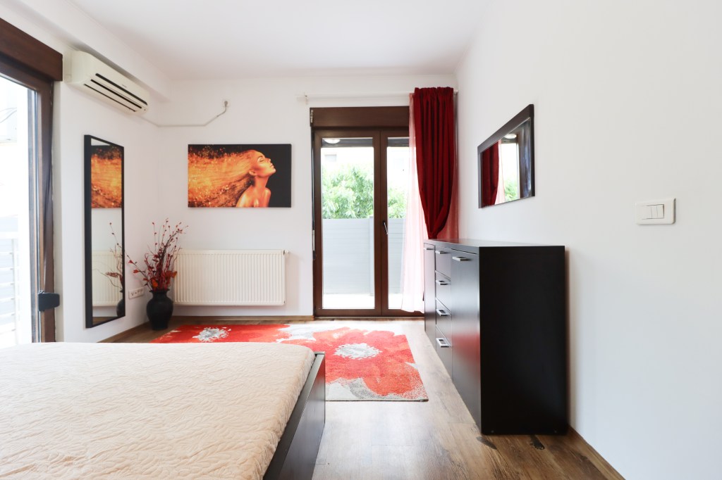 Compus din dormitor, hol folosit (ca dressing) și grup sanitar, ajunge la 19 mp. Dormitorul are 13 mp, are acces către terasa de 80 mp și este echipat cu pat pentru două persoane și o comodă. Holul de 2 mp are un dressing generos iar grupul sanitar de 4 mp este echipat cu cadă, mașina de spălat rufe își are locul aici iar geamul își face treaba.