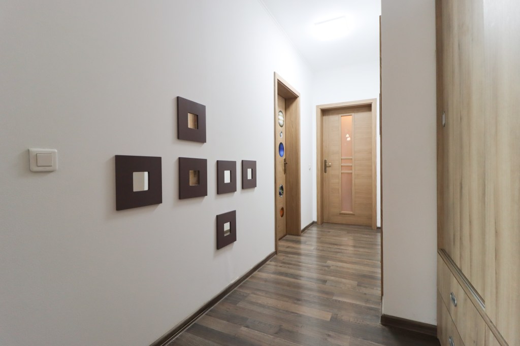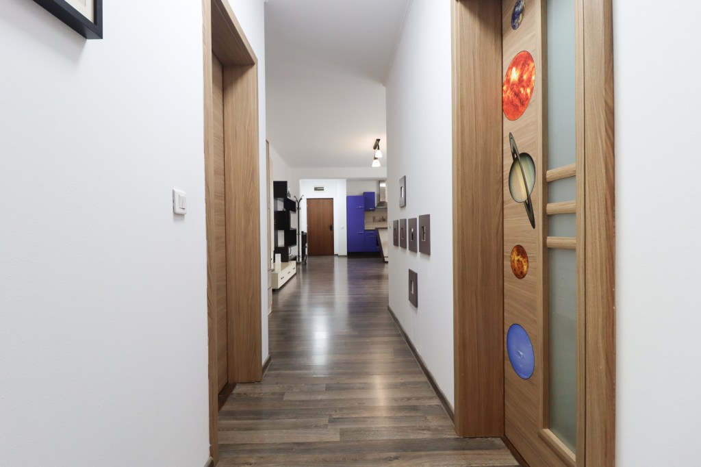 În momentul în care pășești înăuntru intri într-un hol de unde avem acces în partea stângă în bucătărie iar înainte avem acces în living.
