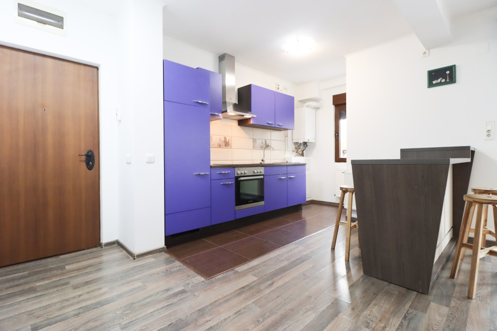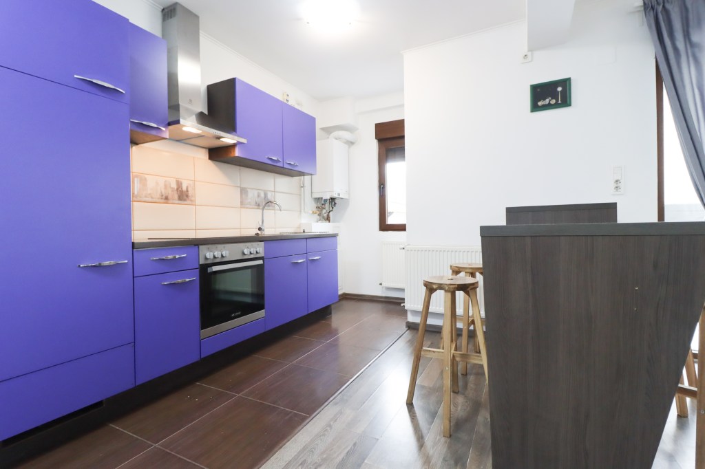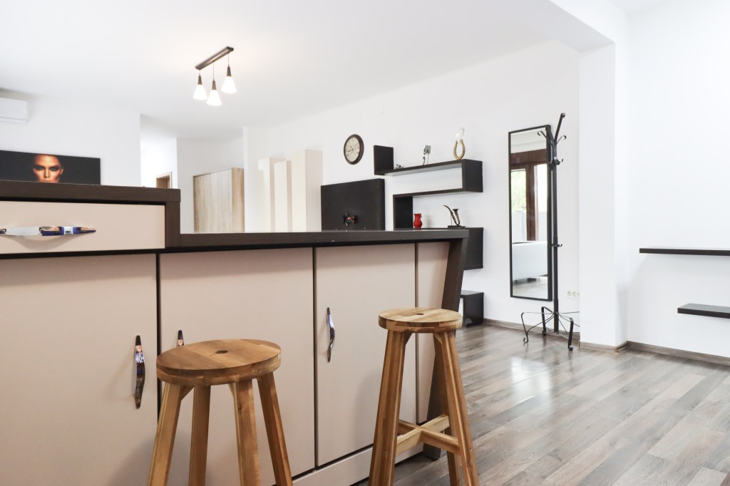 Bucătăria are suprafața de 8 mp, în partea stângă avem zona de preparare iar pe partea dreaptă avem o insulă cu spații pentru depozitare la care pot lua loc 4 persoane.