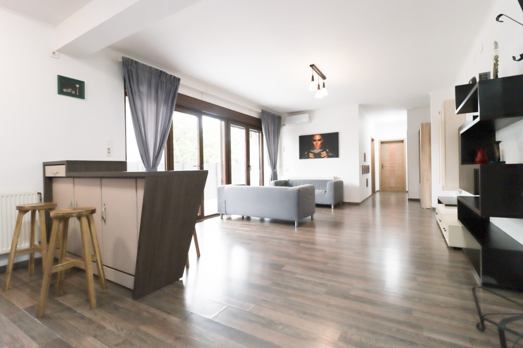 Livingul are 29 mp, are o zonă de relaxare cu două canapele și zona de depozitare unde avem loc suficient pentru cărți și pentru un televizor pe măsură. De aici avem acces pe terasa de 14 mp sau în zona de seară.