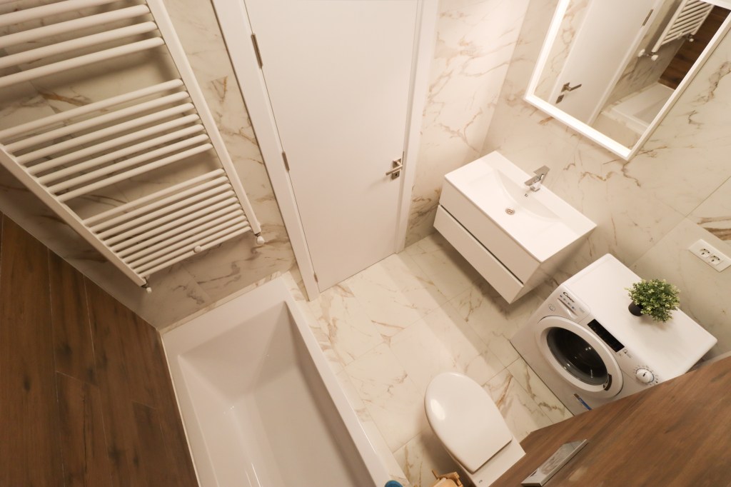 Aceasta are 4 mp, culorile sunt bine alese, avem cadă, lavoar, oglindă și ventilator pentru aerisire eficientă. Mașina de spălat rufe își are și ea locul aici.