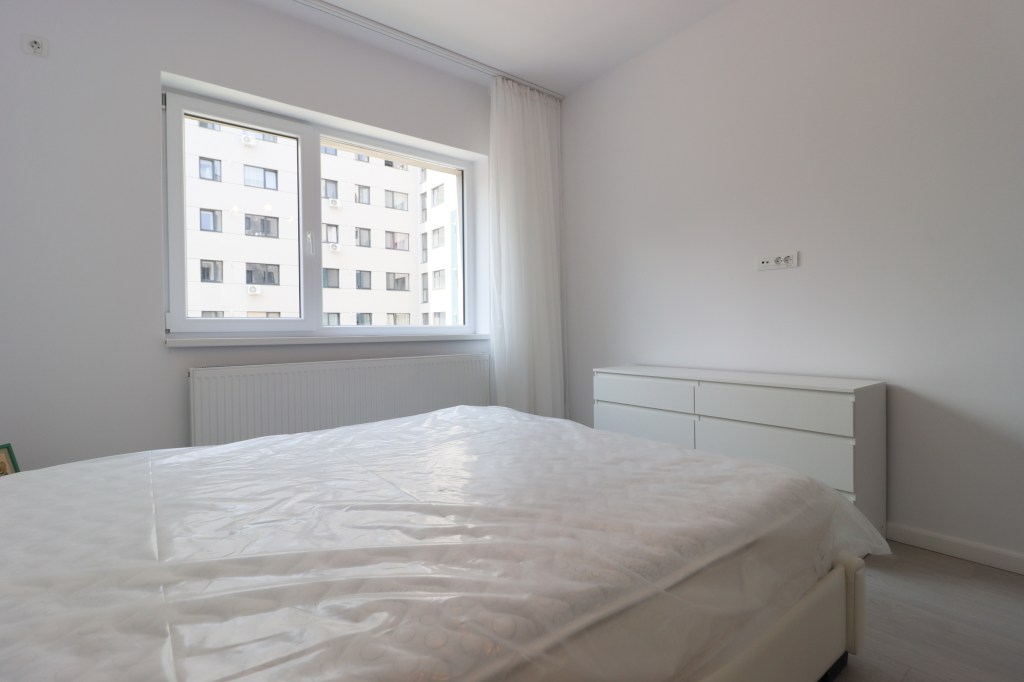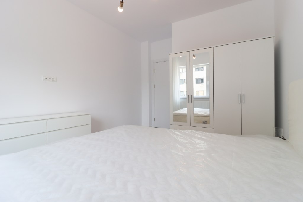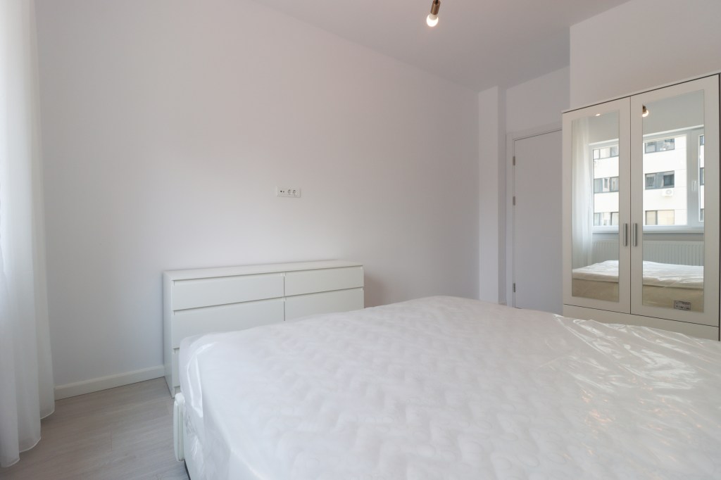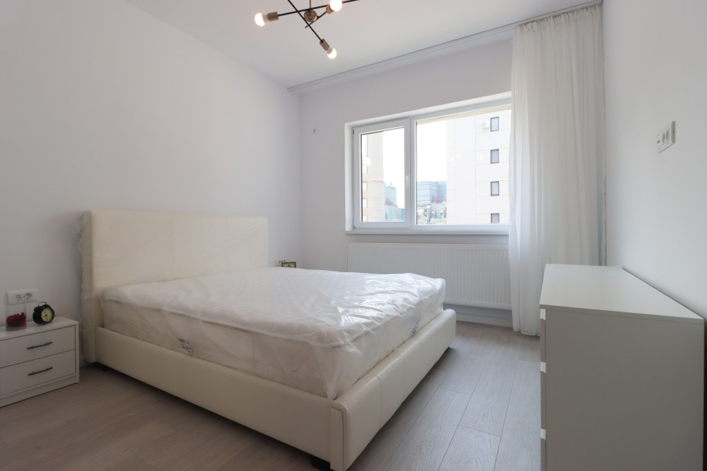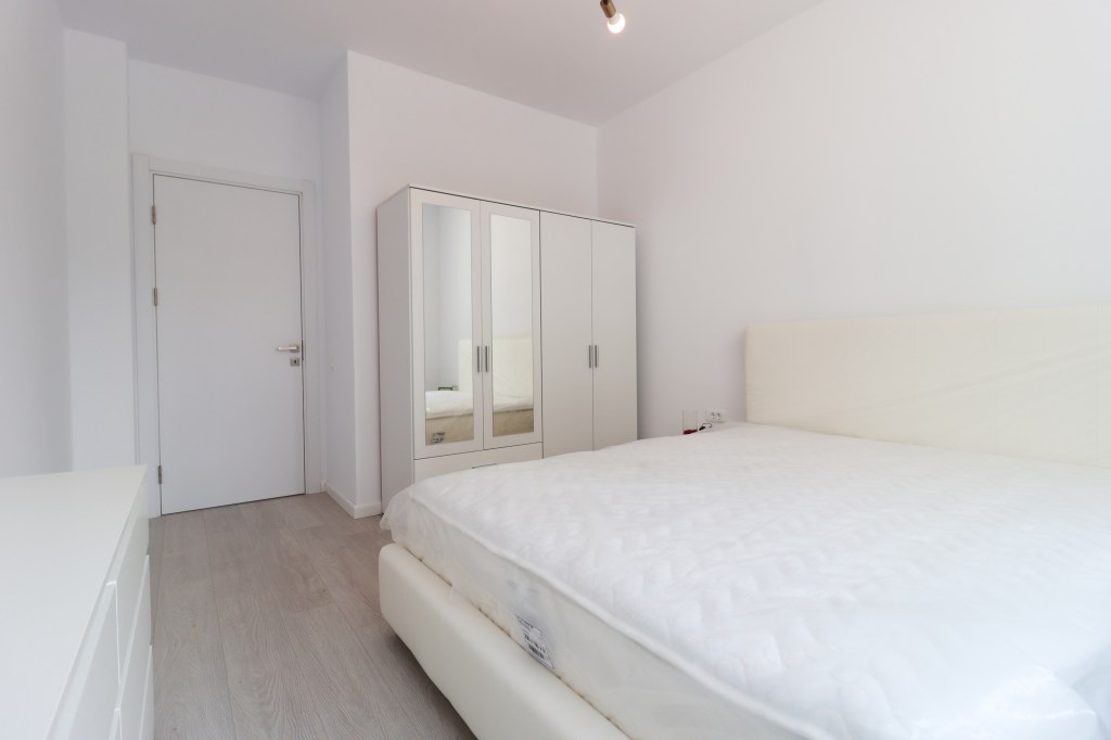 Este simplu dar practic, 13 mp. Avem un pat pentru două persoane, două noptiere, o comodă și un dressing. Vederea este spre curtea imobilului, la fel ca toate camerele.