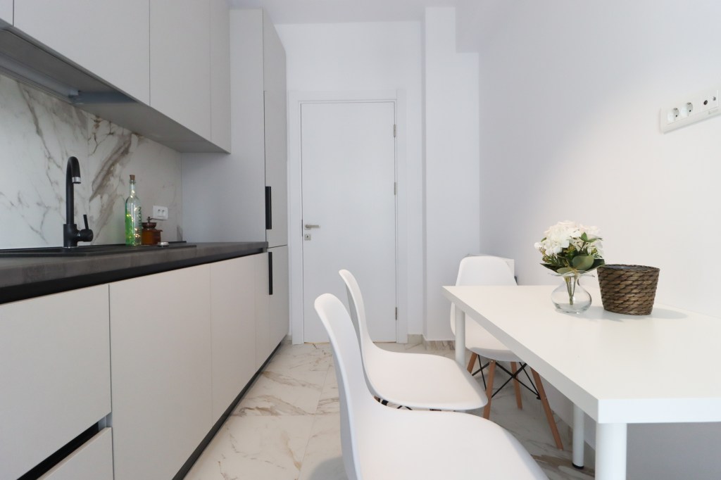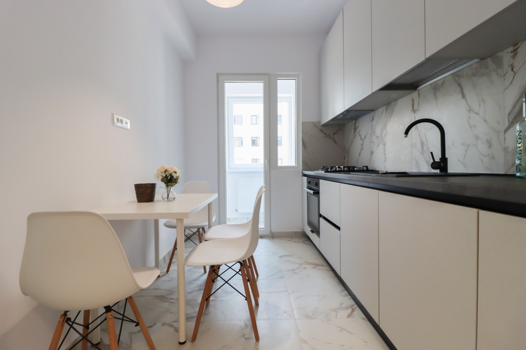 Aceasta are 8 mp, pe partea dreaptă avem spațiul de pregătire și preparare iar pe partea stângă o zonă de luat masa pentru 3 persoane. De aici avem acces în balconul de aproximativ 2 mp, unde este montată centrala.