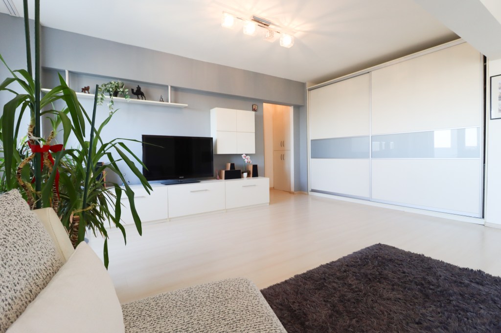 Livingul are o suprafață mare, 35 mp (este format din două camere) în care ai loc să te desfășori. Aici găsim o zonă de relaxare unde avem o canapea, două fotolii și o masă de cafea, vis a vis avem comoda pe care stă televizorul și cu câteva corpuri suspendate iar opus de gamuri avem două dressinguri foarte generoase care vor prelua toată garderoba voastră. De aici avem acces pe balconul închis, de 6 mp ce se întinde și pe dormitor și către zona de seară unde avem dormitorul și grupul sanitar.