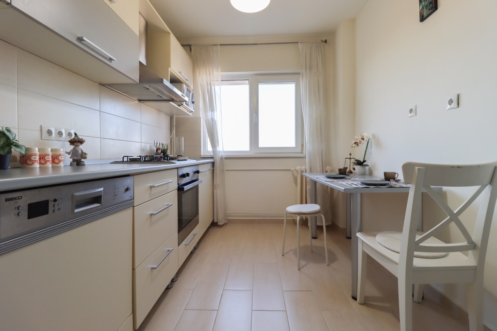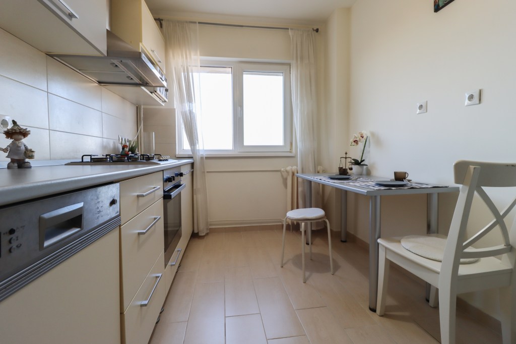 Este încăpătoare 10 mp și utilată complet. Avem pe partea stângă zona de preparare cu blat mare, aici găsim și mașina de spălat vase, iar pe partea dreaptă avem zona de servit masa unde pot lua loc trei persoane și frigiderul.