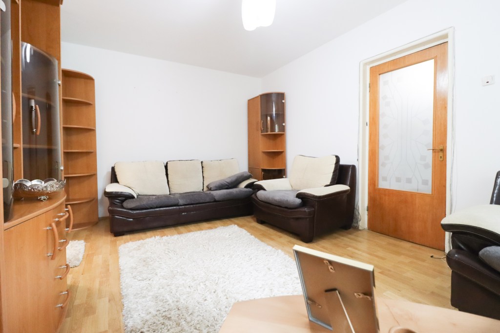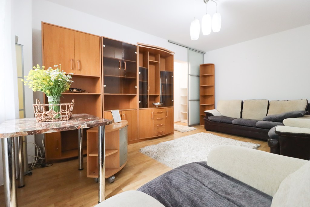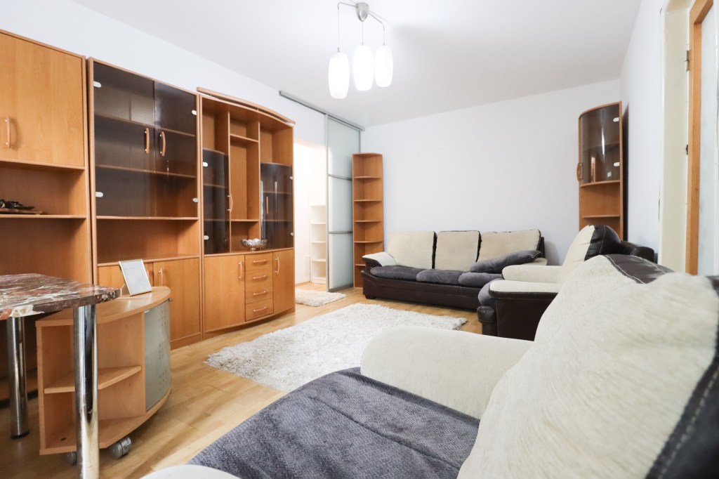 Acesta este generos și avem o canapea, două fotolii, o comodă pentru televizor și 3 corpuri pentru depozitarea lucrurilor tale. Din acest loc avem acces și pe balconul de 3 mp ce poate ține ca loc de relaxare sau depozitare.