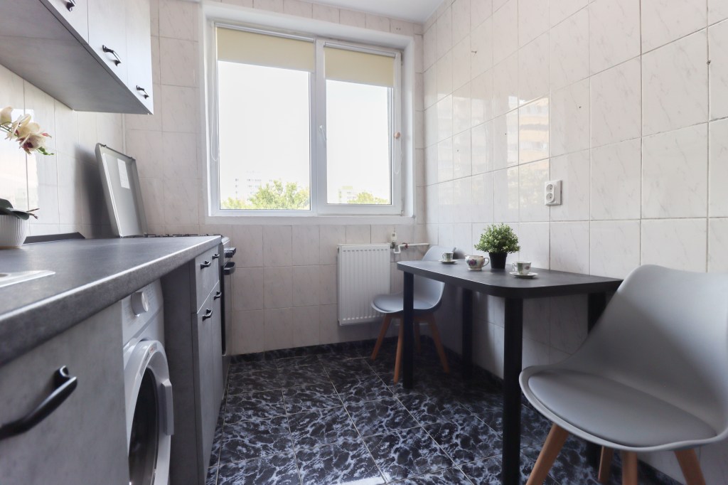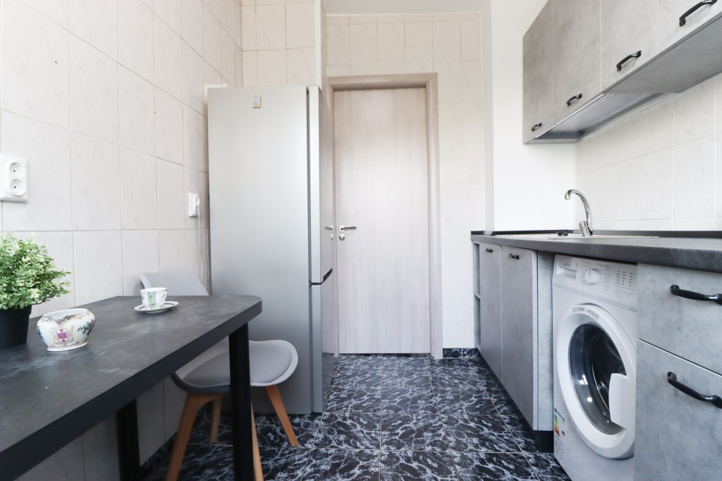 Este încăpătoare 6 mp și utilată complet. Avem pe partea stângă zona de preparare, aici găsim și mașina de spălat rufe, iar pe partea dreaptă avem zona de servit masa unde pot lua loc două persoane.