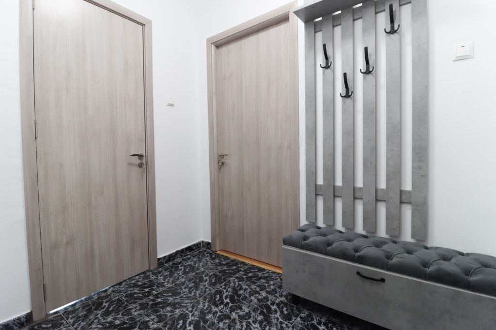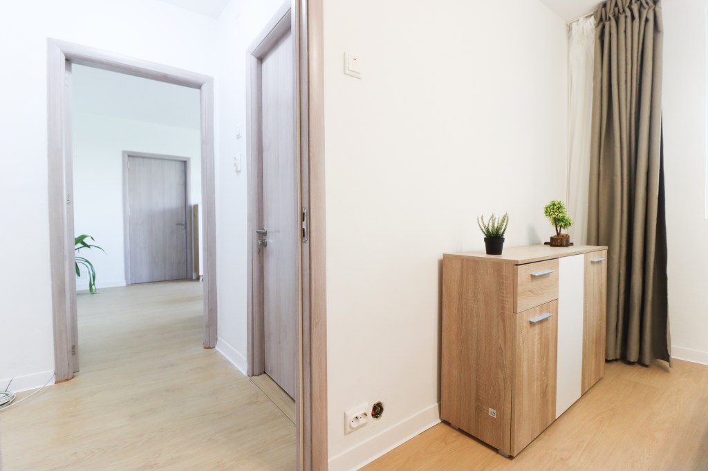 În momentul în care pășești înăuntru intri într-un hol unde avem un cuier cu un pantofar și u dressing potrivit pentru gecile tale. De aici avem aacces înainte către bucătărie iar în partea dreaptă către living.