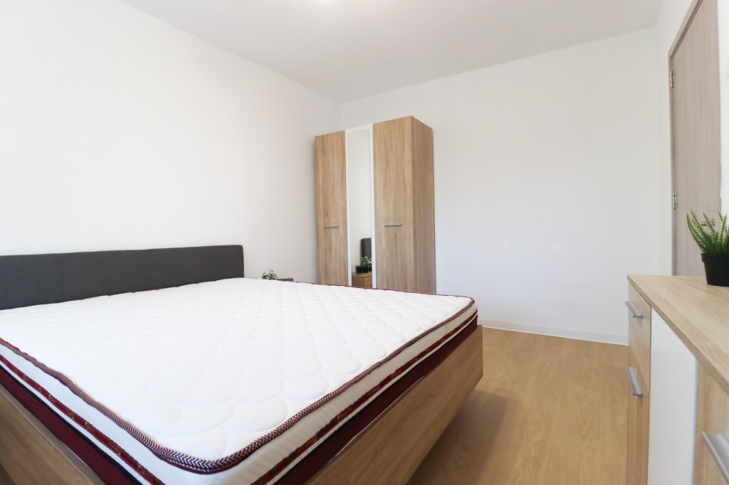 Este simplu dar elegant (12 mp). Avem un pat pentru două persoane la care se adaugă două noptiere, un dressing și o comodă.