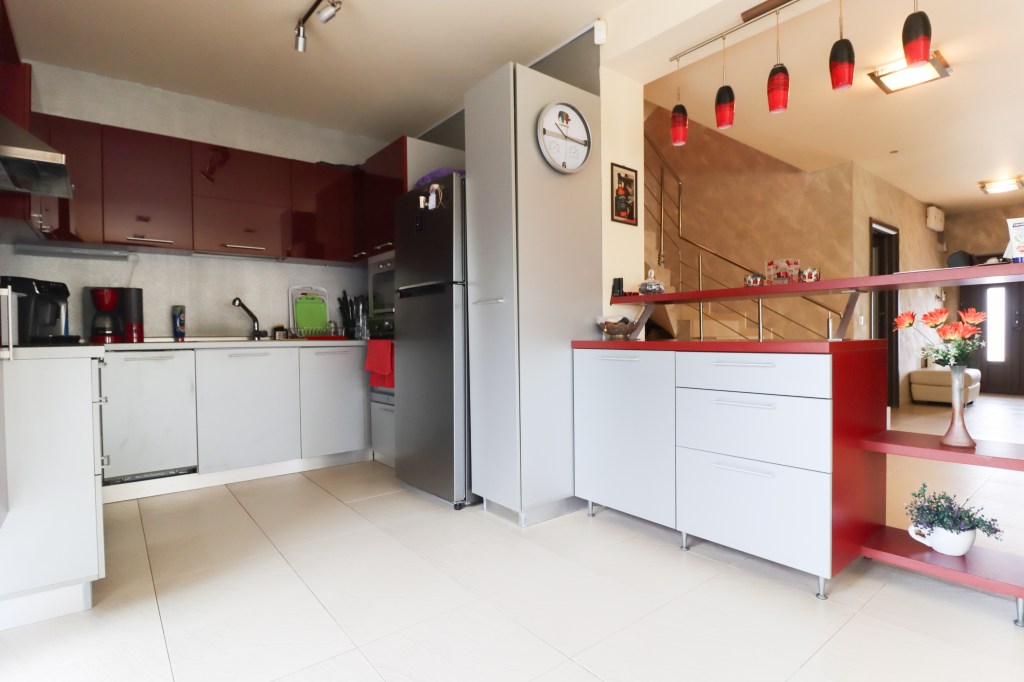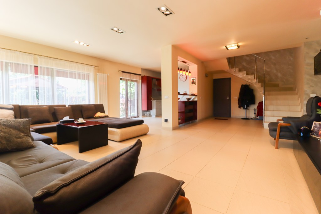 Începem cu parterul. Aici avem un living genros, cu o bucătărie deschisă (dacă nu îți place se poate închide cu ușurință), un dormitor/birou cu o suprafață peste 15 mp și un grup sanitar de serviciu dotat cu duș și geam. Cu holul, camera tehnică, scările și terasele ajungem doar pe parter la o suprafață utilă totală de 154 mp.