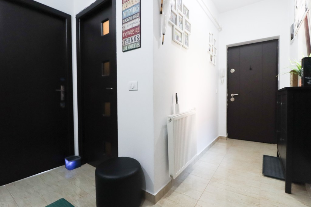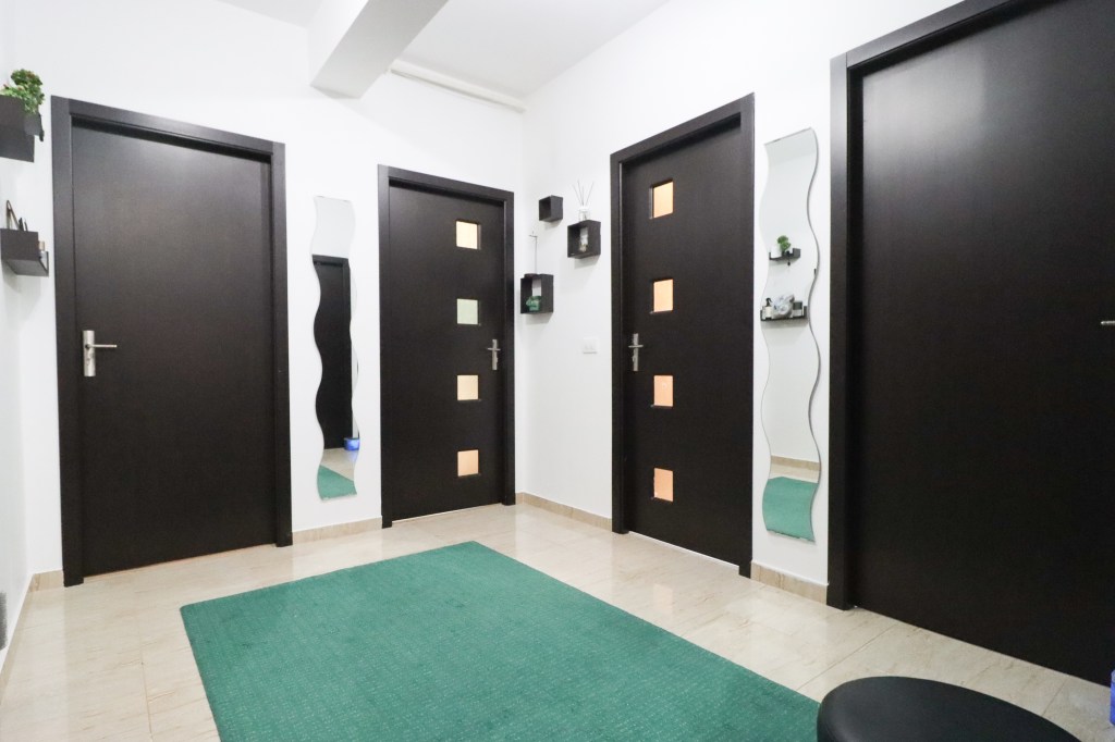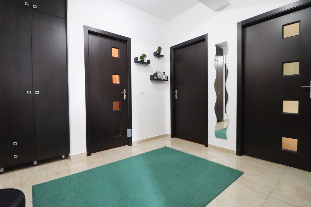 În momentul în care pășești înăuntru intri într-un hol de 11 mp unde avem un pantofar (deasupra lui avem și un geam) și un dressing încăpător. De aici în partea dreaptă avem prima dată grupul sanitar, apoi dormitorul mare și bucătăria. Înainte găsim livingul și cu dormitorul mic iar în partea stângă avem grupul sanitar de serviciu.
