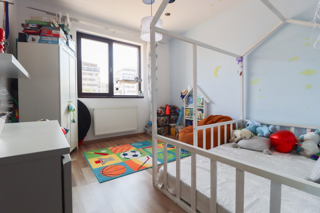 Aici avem 12 mp, în momentul acesta este camera pentru cei mici. Vederea este pe față iar ca punct cardinal avem sudul.