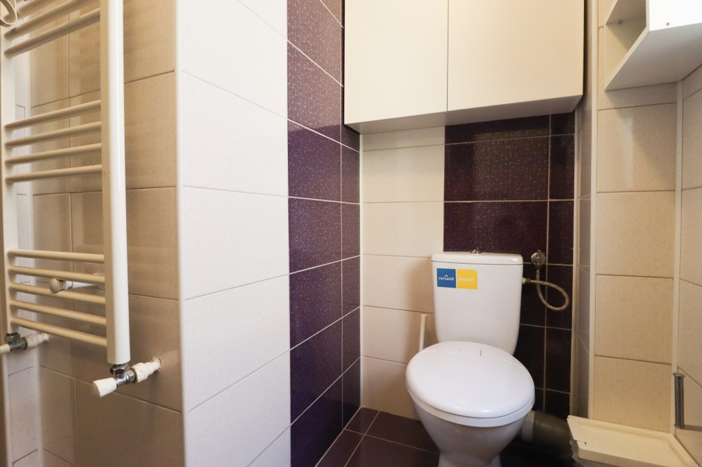 Aceasta are 3 mp, este dotată cu cadă, avem mașină de spălat rufe și uscător iar aerisirea se realizează cu ajutorul ventilatorului.